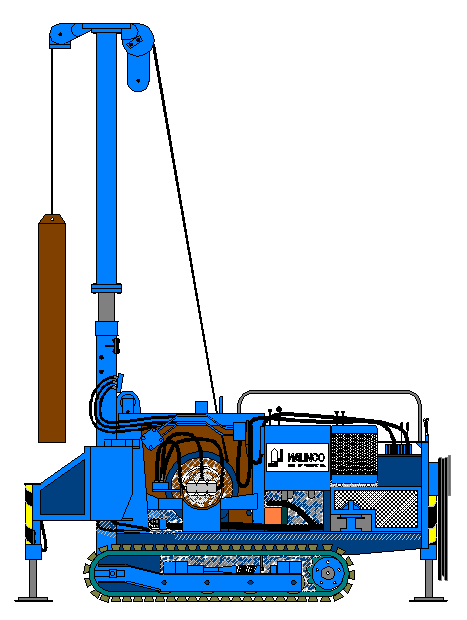 Tekening van een zeer kleine funderingsmachine (een voorbeeld, want ook kleinere en grotere machines zijn beschikbaar). breedte: 0,7 meter lengte: 2,8 meter doorrijhoogte: 2 meter (eventueel na demontage 1,75 meter) werkhoogte: vanaf 2 meter capaciteit: heiblokken tot 1000 kg zwart/wit terug |